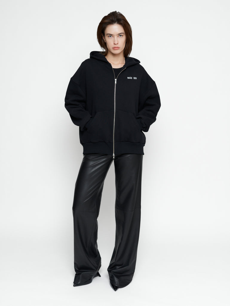 Unisex juodas džemperis su dviem kryptimis atsegamu užtrauktuku ir minimalistiniu MÁS924 logotipu priekyje.
