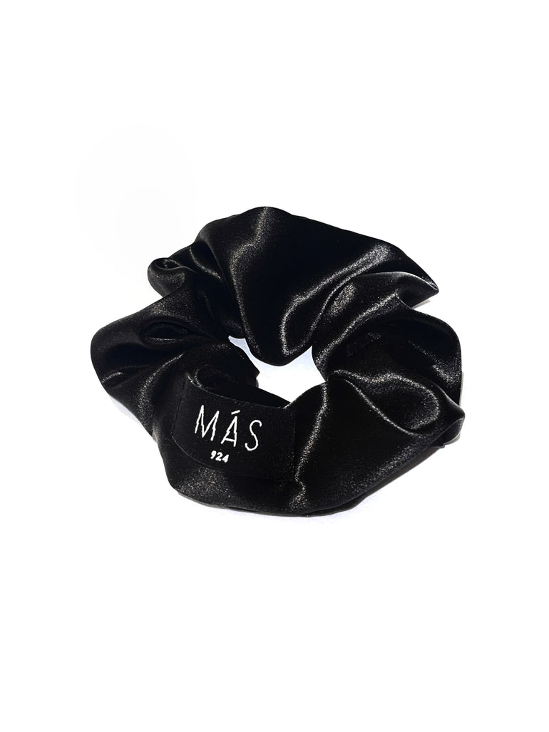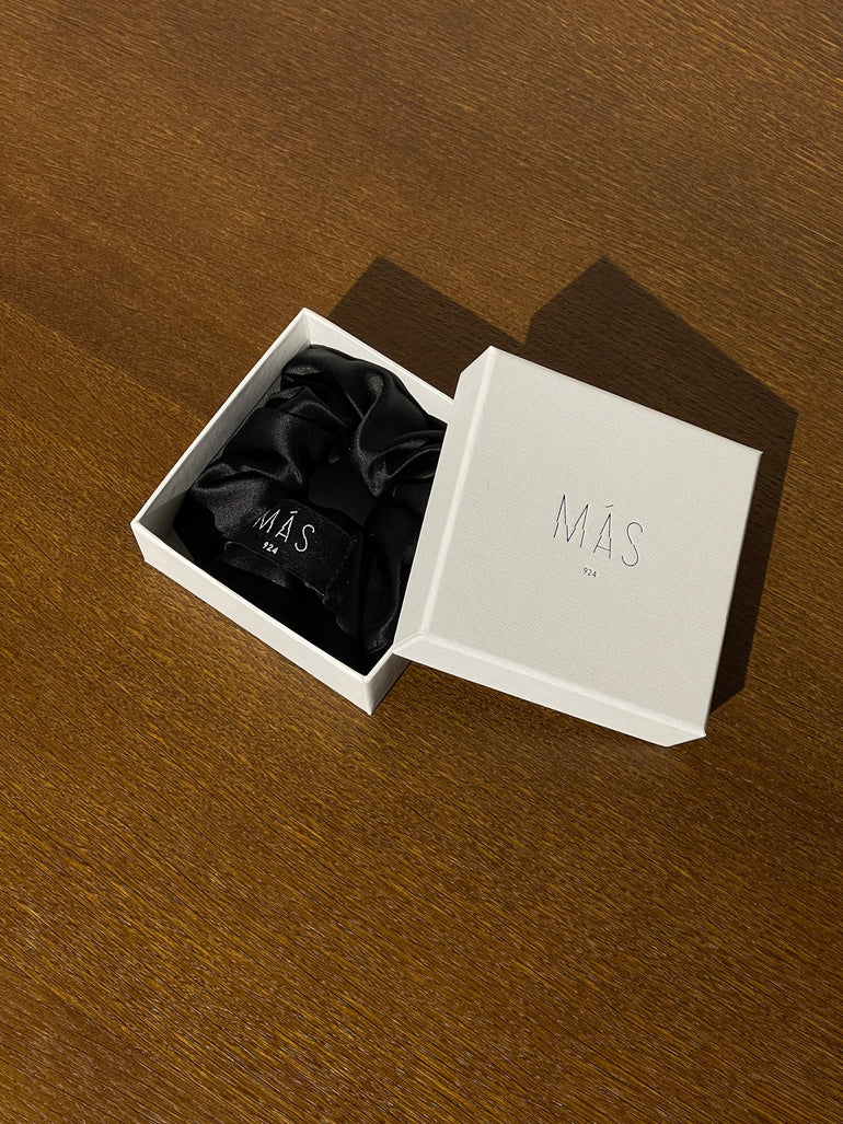 Juodos spalvos šilkinė gumytė su MÁS924 etikete.