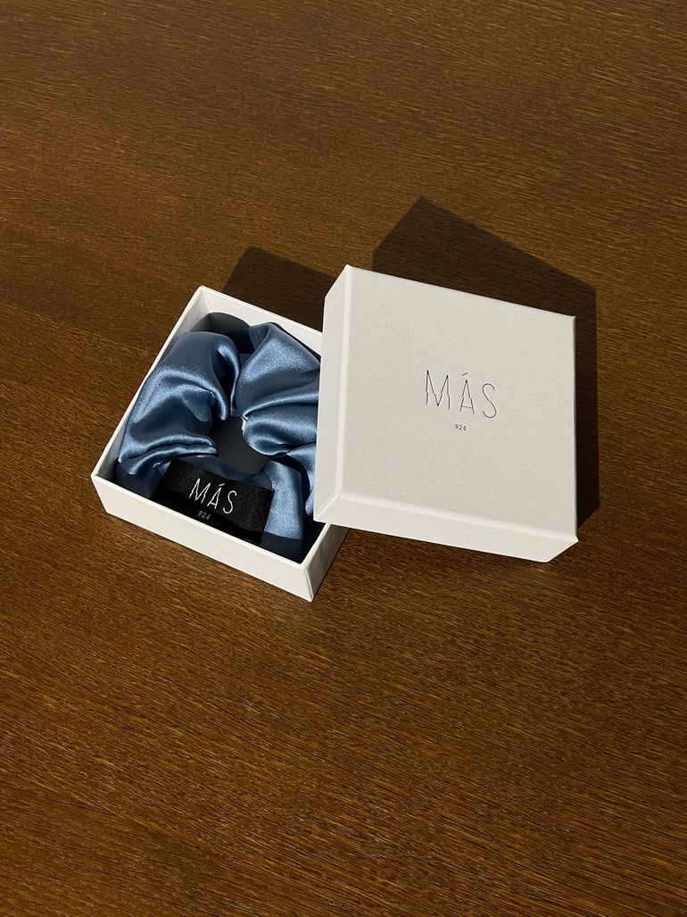 Pilkai melsvos spalvos šilkinė gumytė su MÁS924 etikete.